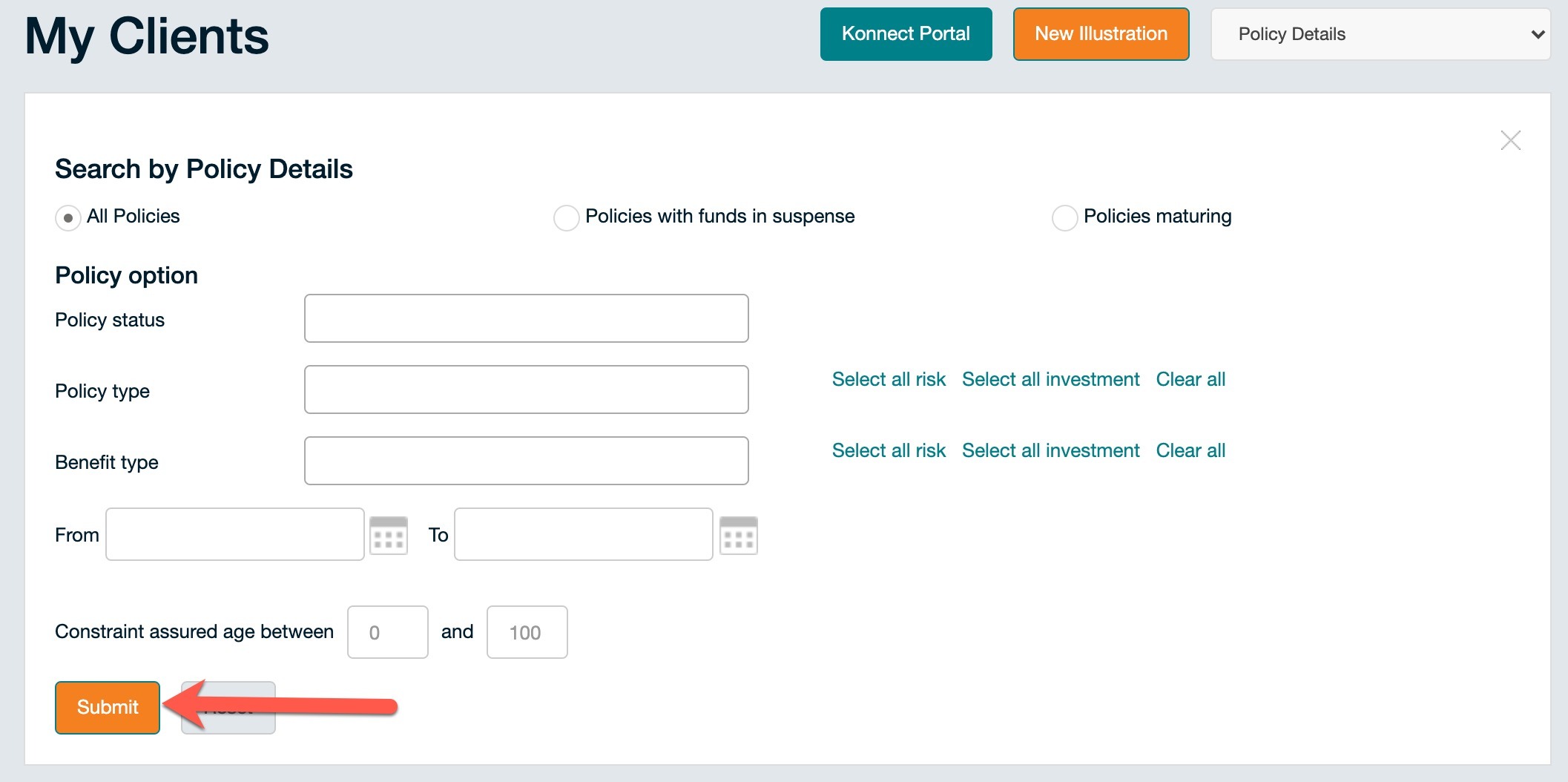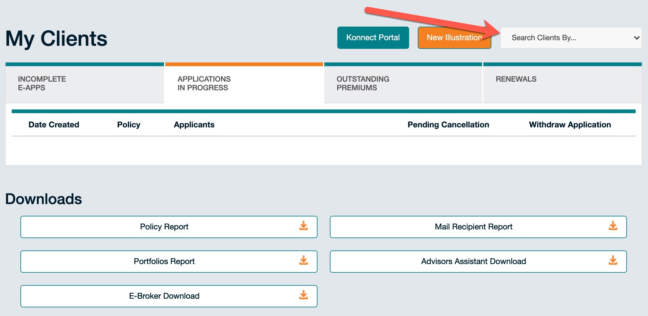 While still in the adviser area of Fidelity Life, click "Search Clients By..." (see screenshot below)