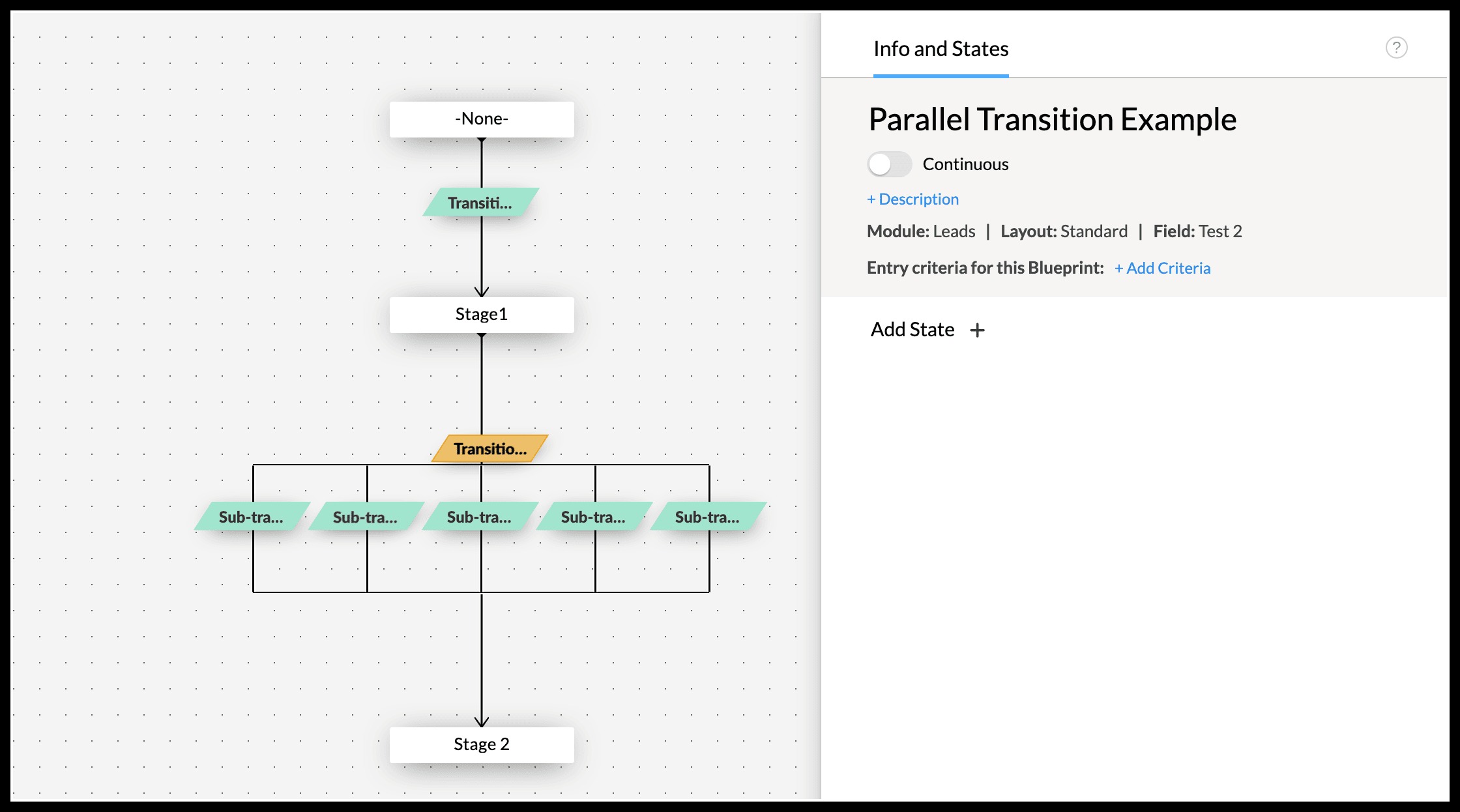 - Add multiple transitions between the states, as required. When creating multiple transitions between two stages, do not check the Parallel Transition checkbox.
