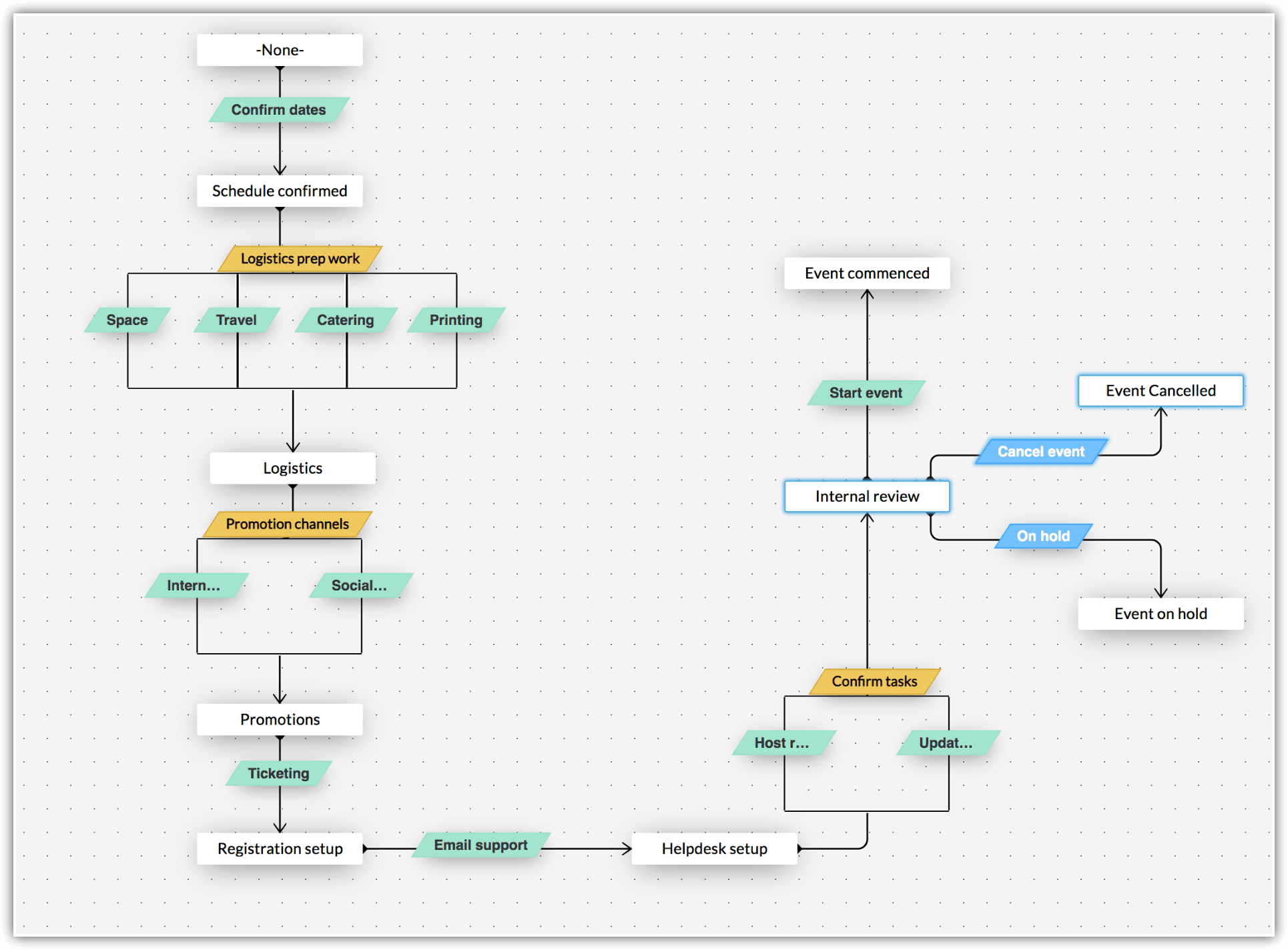 In a blueprint, each stage or milestone is defined as a State, and the movement between these states is governed by Transitions, which are sets of rules and actions. Typically, a process flows smoothly from one state to the next through these transitions. However, there are scenarios where multiple transitions are necessary between two stages. Imagine a complex process, like event planning, where multiple tasks need to be executed concurrently. This is where Parallel Transitions come in.