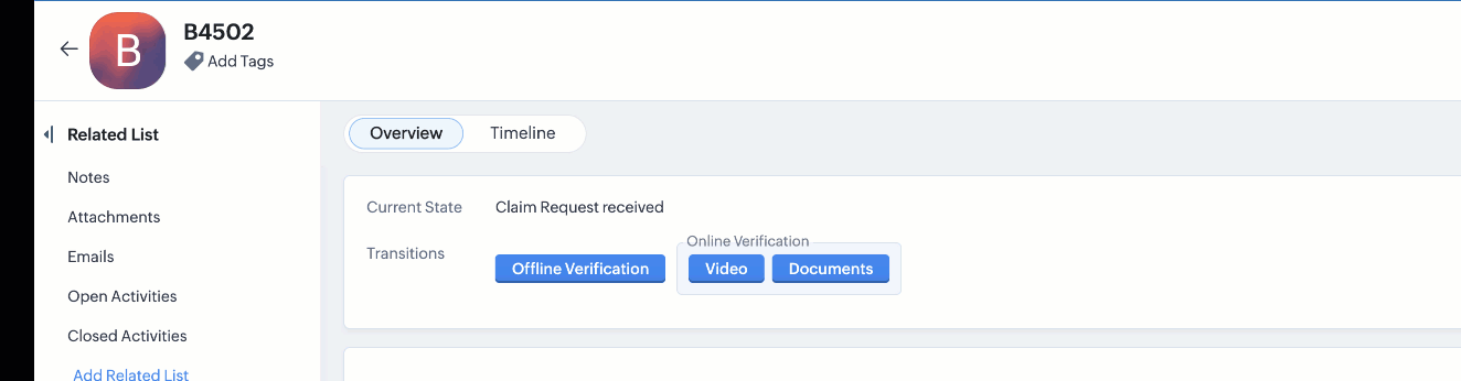 For example, imagine a vehicle insurance company processing a claim. After a client submits a claim, a surveyor must verify the vehicle before approving the claim. The surveyor has two options: conduct an online verification by requesting videos, photos, and relevant documents, or perform an in-person inspection at the vehicle owner’s location. Here, you could create a standard transition for offline verification or set up a parallel transition for online verification between the two stages. Once the surveyor completes either the standard in-person verification or both sub-transitions of the online verification process, the insurance claim can proceed to the approval stage.