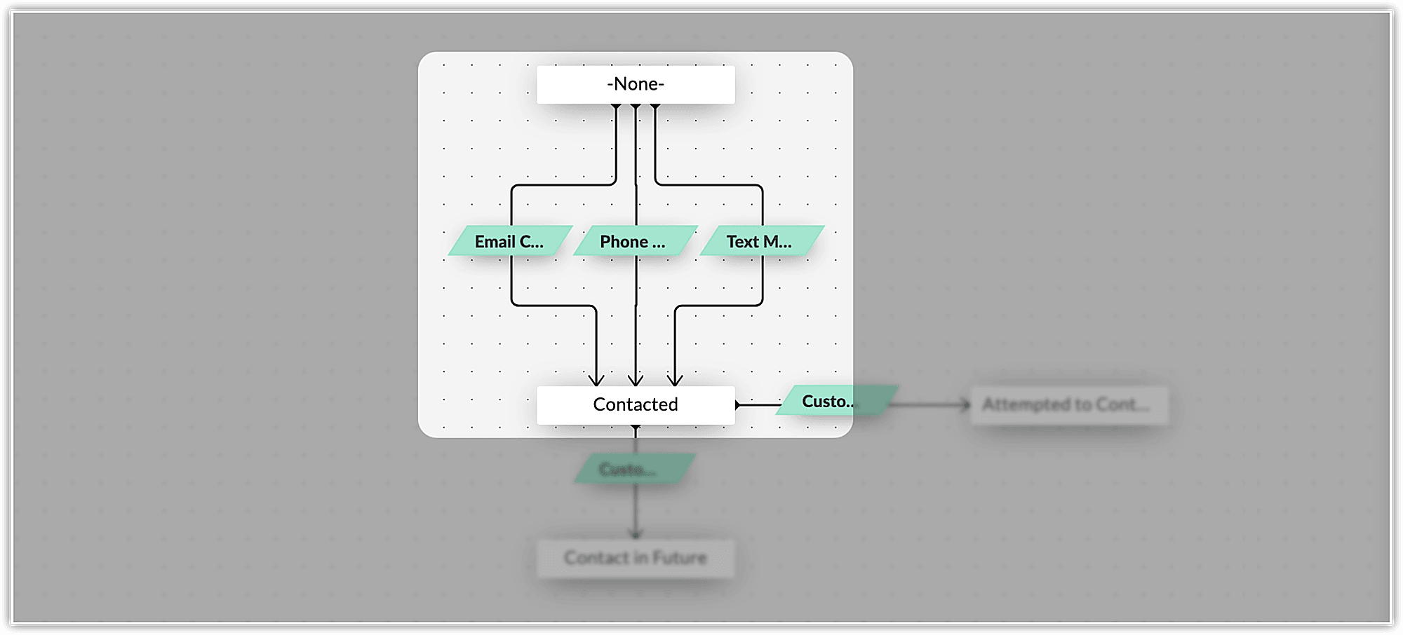 For instance, in lead management, different methods can be used to contact a lead—email, phone call, or text message. Each of these methods can be set up as a separate transition between the "Lead Created" and "Contacted" states. Regardless of the method used, the lead's status will move to "Contacted" as long as one of these transitions is completed. This flexibility allows the sales team to engage with leads in the most effective manner.