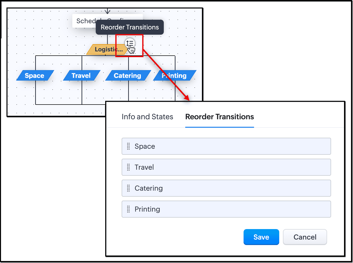 Reorder TransitionsYou can rearrange the order of transitions in a parallel transition. When you hover over the parallel transition, a reorder option will appear, allowing you to adjust the sequence of the transitions as needed.