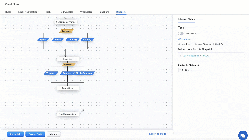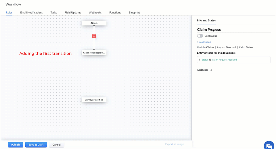 - Once you have set up all the transitions, click Publish to finalize the Blueprint and publish it.