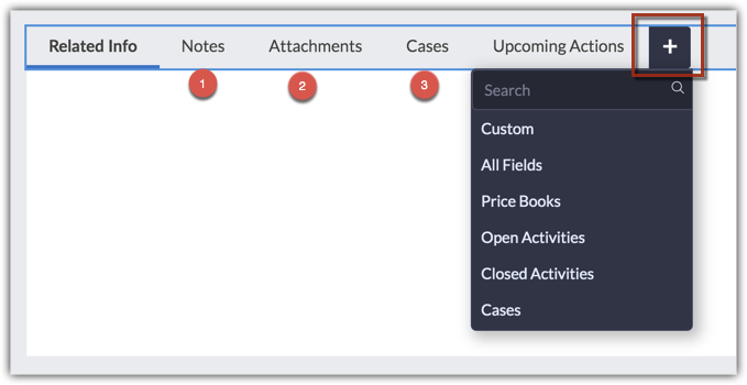 - Tabs: Tabs allow you to organize fields and related lists into different screens. This is a best way to provide easy navigation and a well organized display to the users. For example, in the image below, the tab named Related Info in placed in the products module which has three tabs: Notes, Attachments, and Cases all within a section. By clicking on the + icon you can add more fields or related lists as tabs.