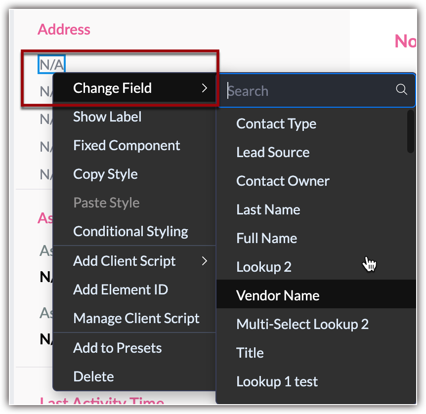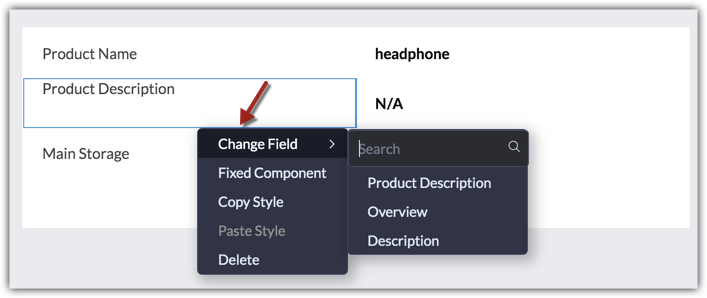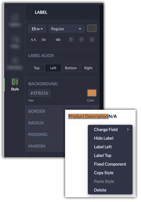 - Right click on the label to change the field, hide label, move the label to the left or top, fixed or fluid component, copy the style and delete the field.