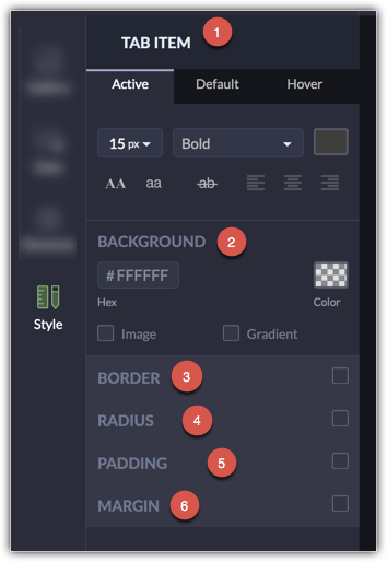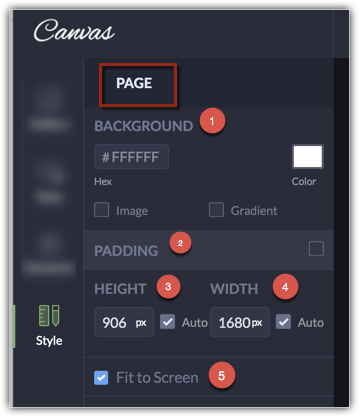 - Style: Style lets you change the font, font size, background color, border, shadow, radius, padding, margin, and insert background image. These changes can be applied by selecting a desired element in the Canvas. The options vary based on the selected element. The style applied on the elements can be saved to the presets and reused in the future.