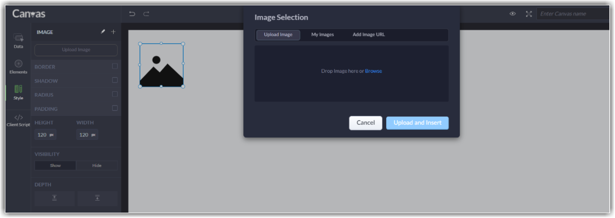 You can browse and upload images from your device or choose from the previously uploaded images saved in My Images tab, or add image from URL. - After adding the image, you can resize it, adjust other styles like border, shadow, radius, padding, etc.