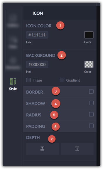 Icon: The icon color, background color, background image, border, shadow, radius, padding, and depth can be customized.