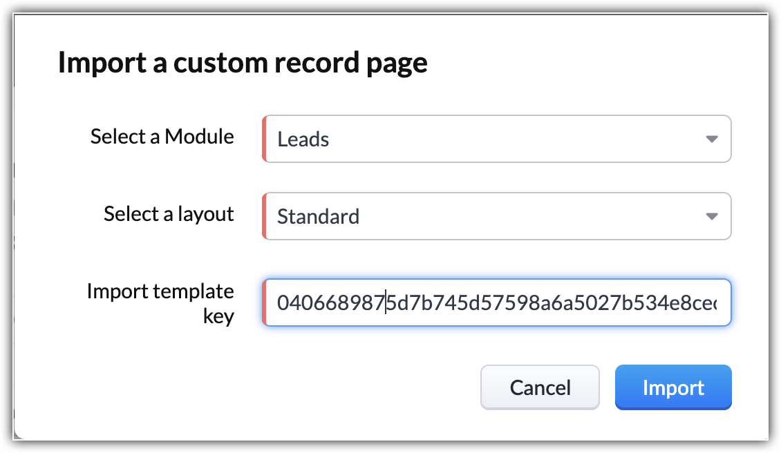 - On the following Import a custom record page, select a module and a layout, paste the template key, and click Import.