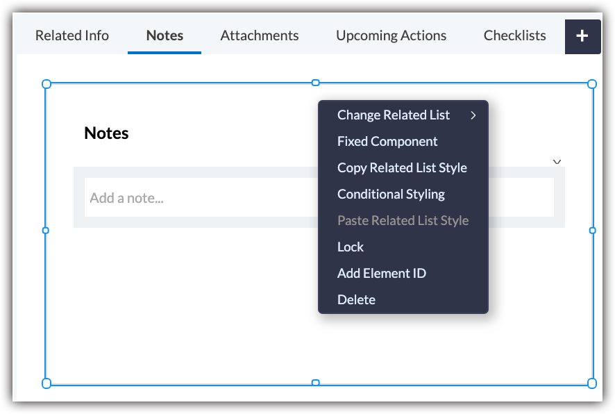 - Right click inside the tab to change one related list to another, fix or fluid component, copy or paste related list style, lock, delete, etc.