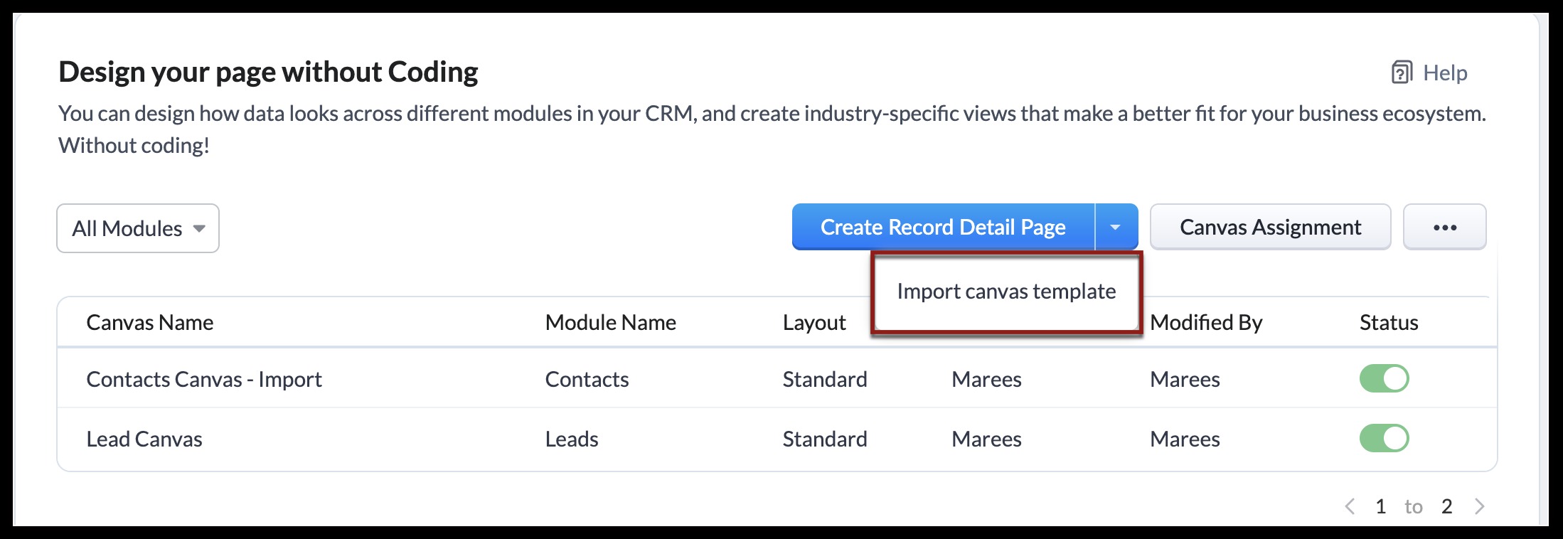 - On the Canvas home page, click on the dropdown next to the Create Record Detail Page button.