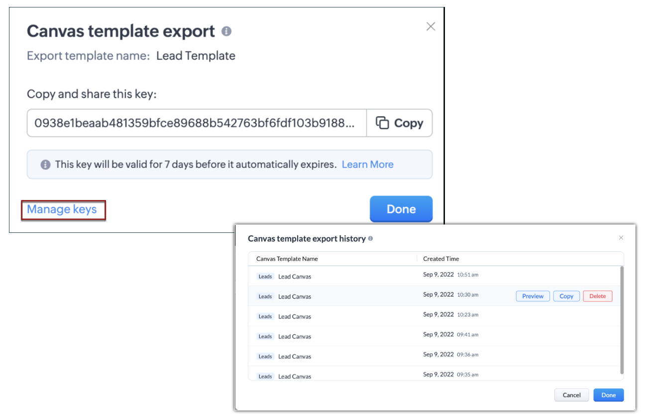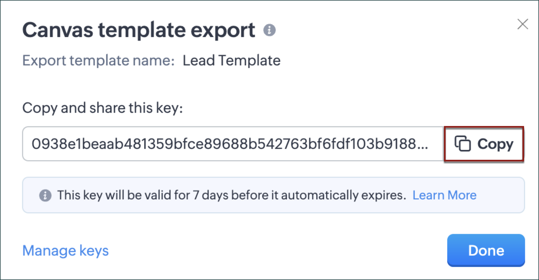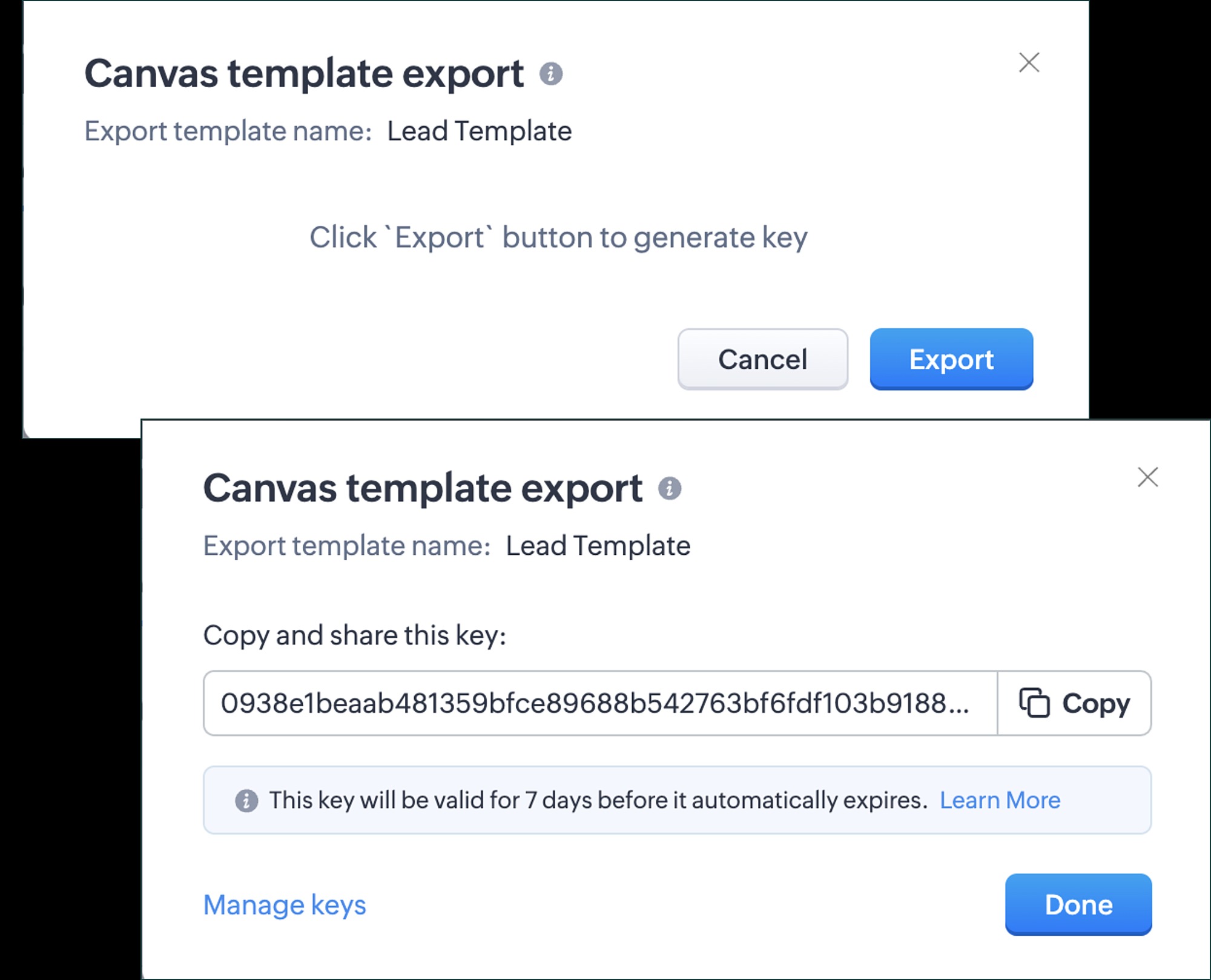 - You can use template keys across modules. In other words, if you've exported a code from a template created for leads, you can use the same code to import the template into a different module. The UI will be transmitted and the fields in the importing module will be automatically adopted by Canvas.