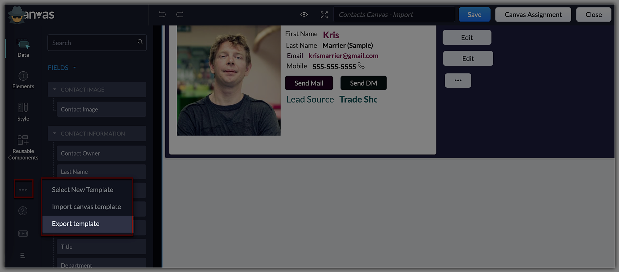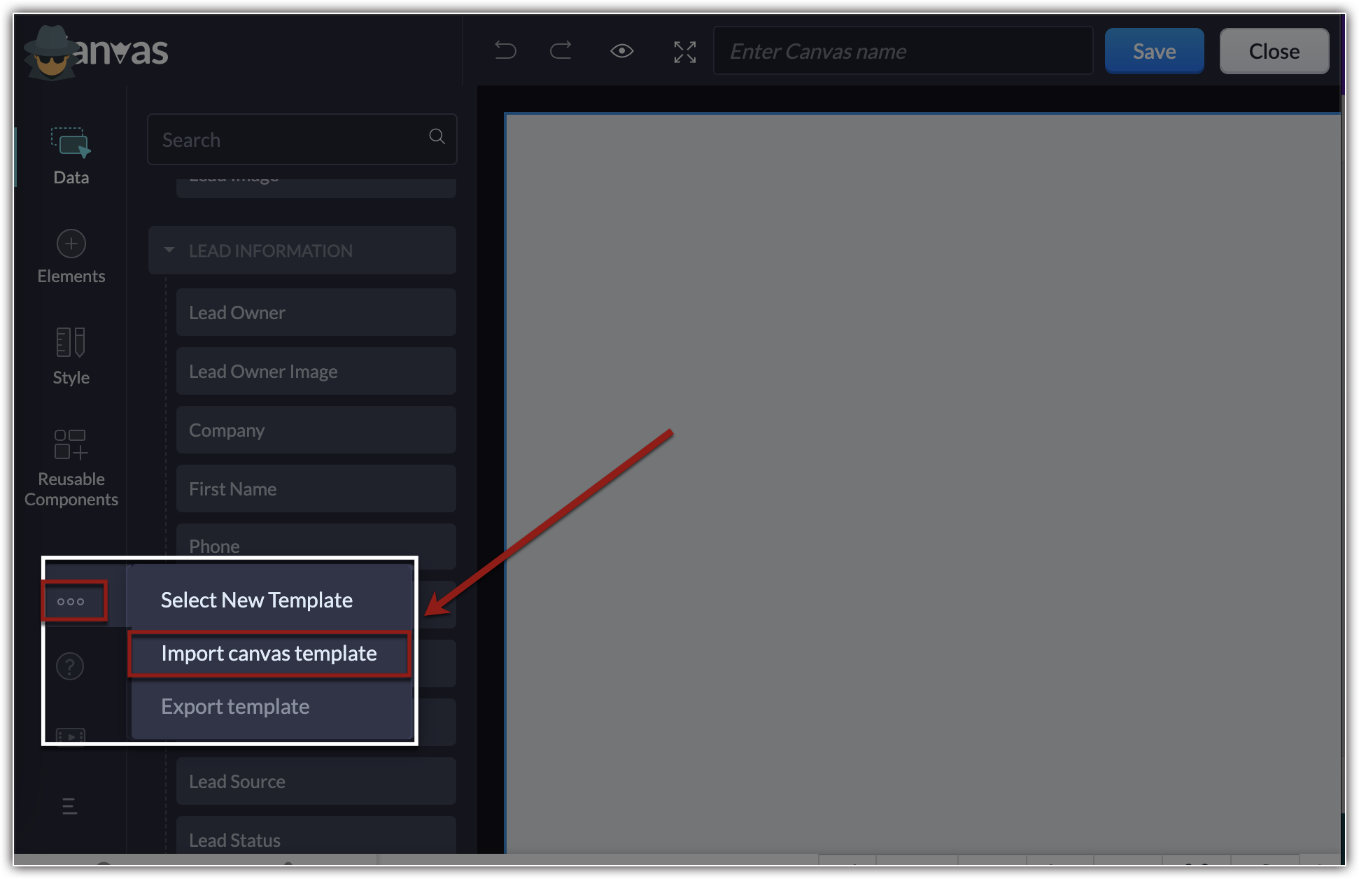 In addition to the above methods of exporting and importing a canvas template, you can export or import a template from the Canvas editor via the following steps: