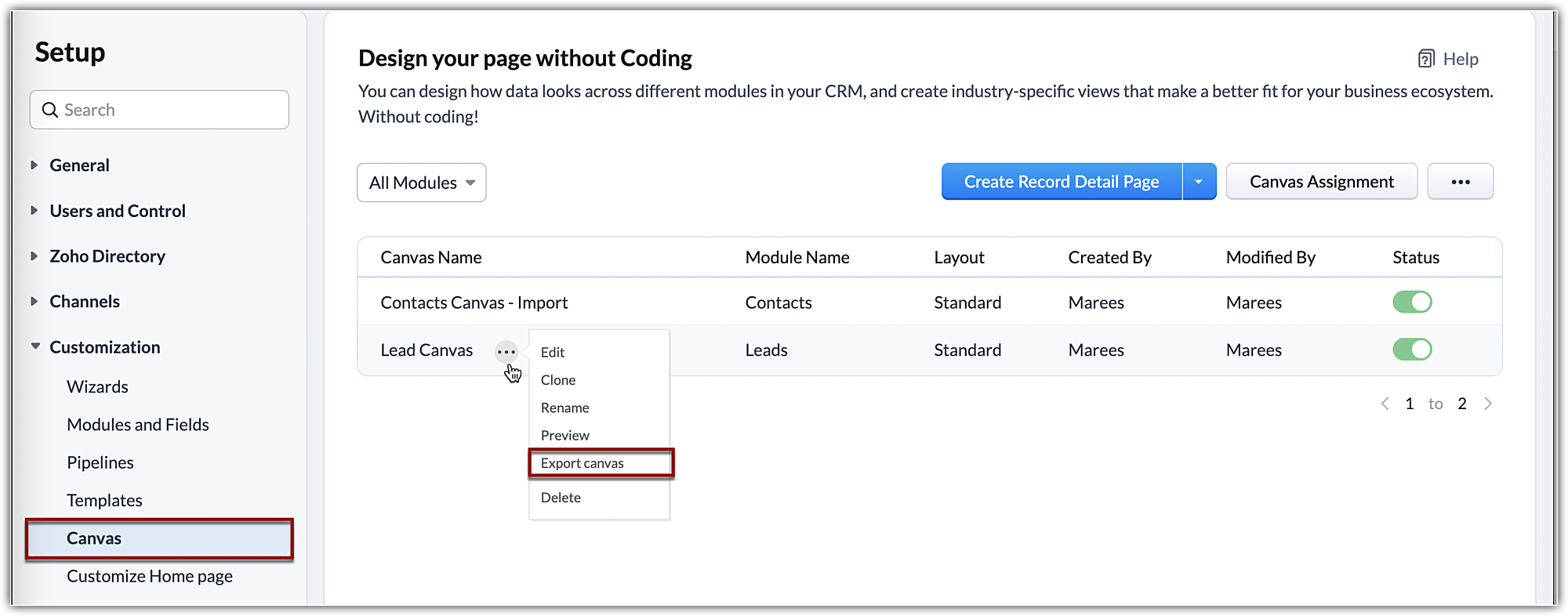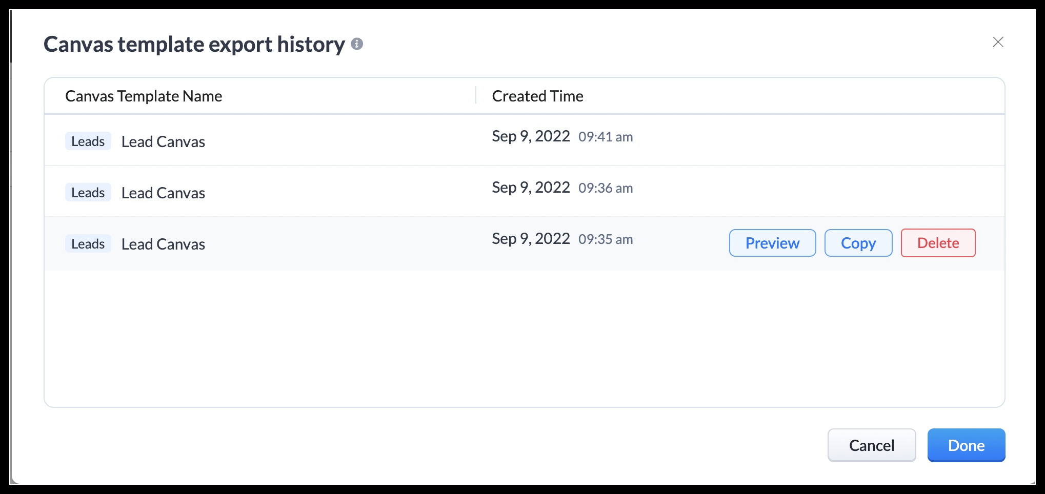 - You can export a template to any organization using a Zoho CRM edition that supports Canvas.