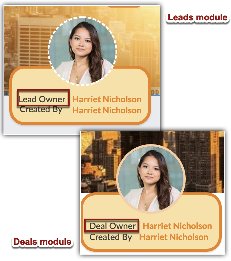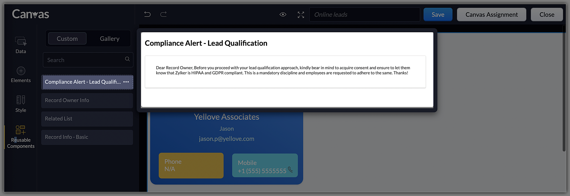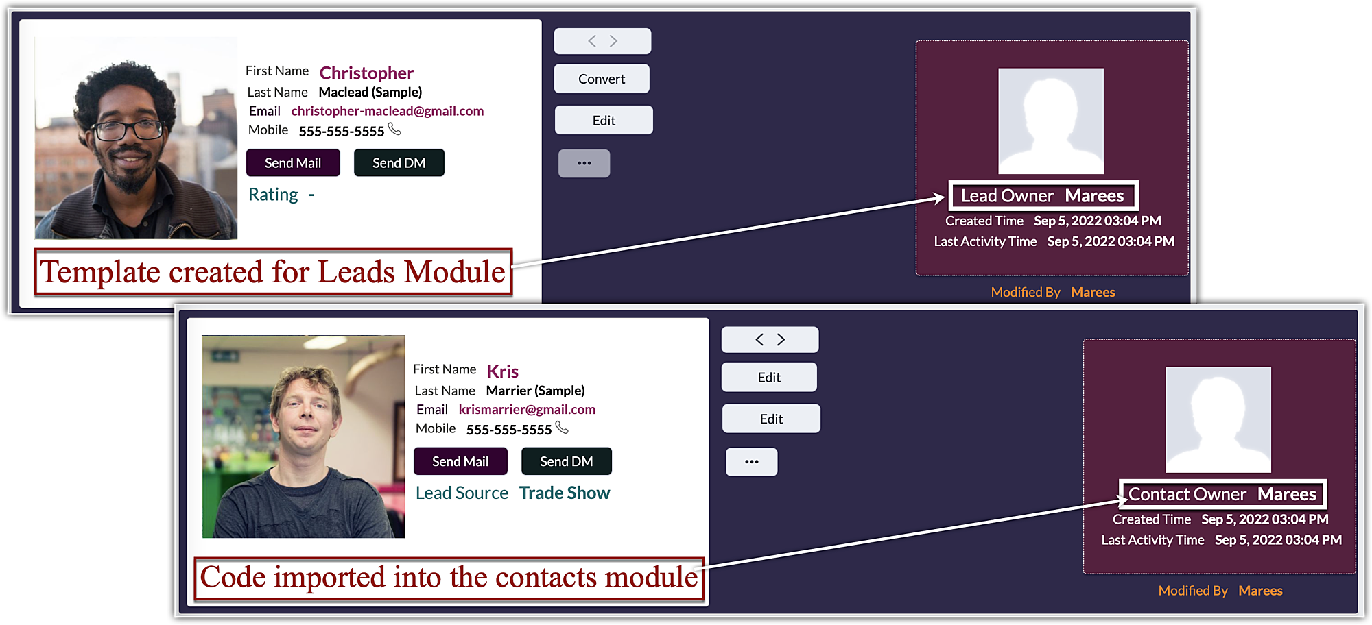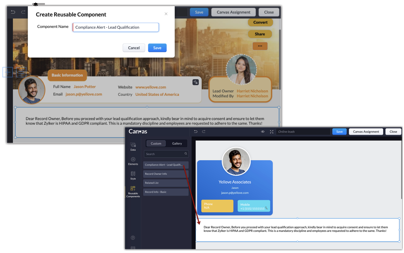 - A component can be reused on templates created for various CRM modules. The fields created for one module will be automatically mapped and displayed with the fields of the other.