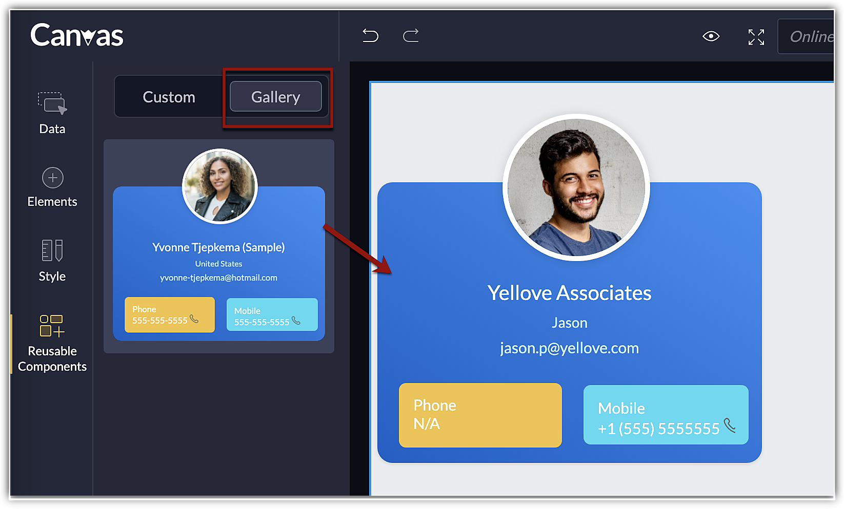 Also, you can choose the pre-existing components from the gallery and add them to the canvas, at ease.