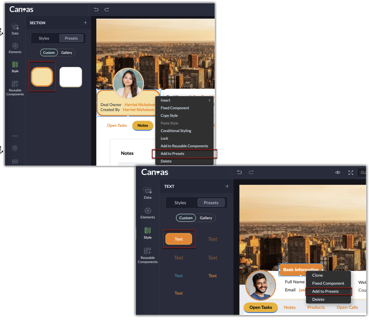 Style options can be added to presets by selecting the element in the canvas and right clicking on it.