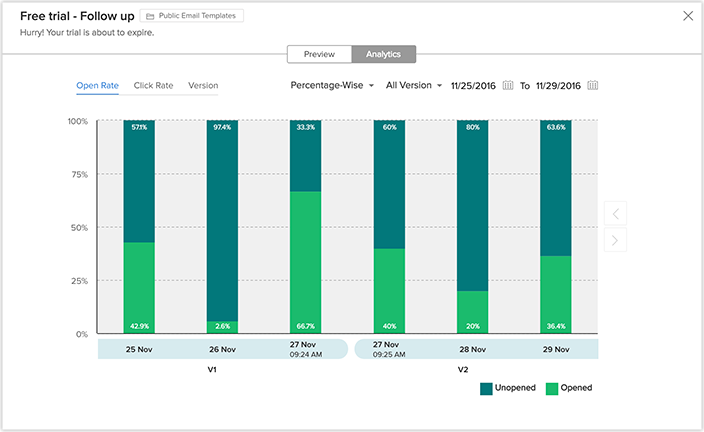 You can also choose to view a preview of the template that you need before sending it. You get a consolidated view of the template analytics here. The percentage of Open rate, Click Rate and Bounce Rate for the different versions of the template are represented in the form of a chart.