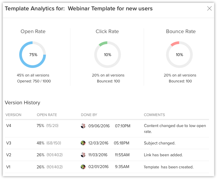 - Version: The Version tab gives you a list of when a template was modified and by whom. Click on it to view a summary of the template with details such as different versions, open rate, click rate, when it was done and by whom.