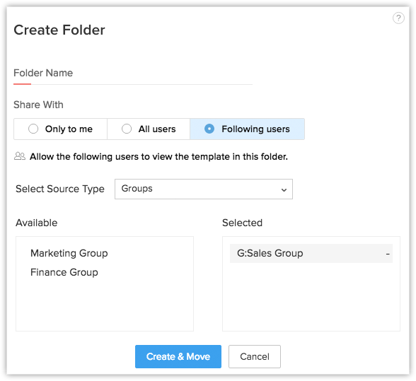 - If you want to create a folder when moving templates, click on the + New Folder after creating the template and enter the folder details and click Create.