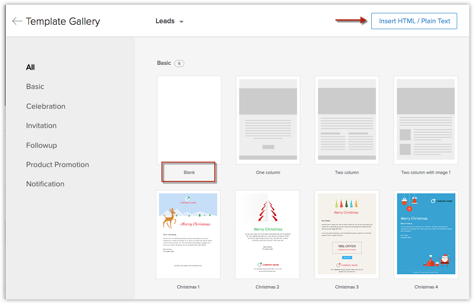 - In the Template Gallery click on the Insert HTML code / Plain text link.
