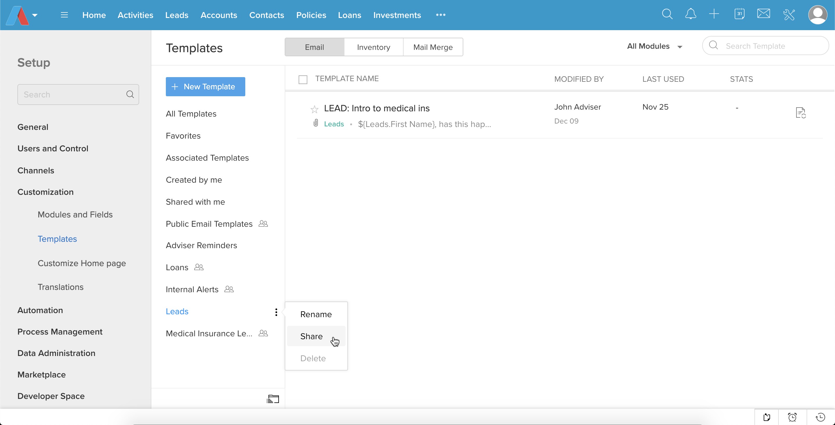 - In Adviser CRM, go to Setup > Customisation > Template.