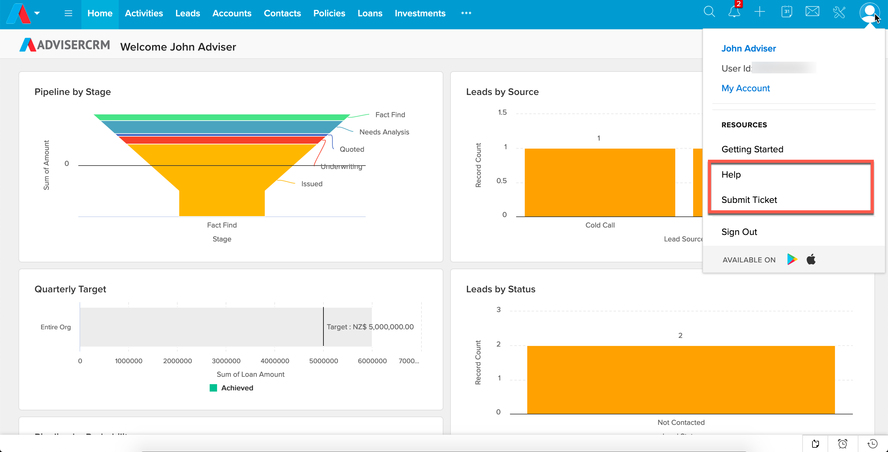 You can access our video tutorials and a range of help articles and documents, as well as send a support request from our team by using the quick menu items inside Advise CRM.